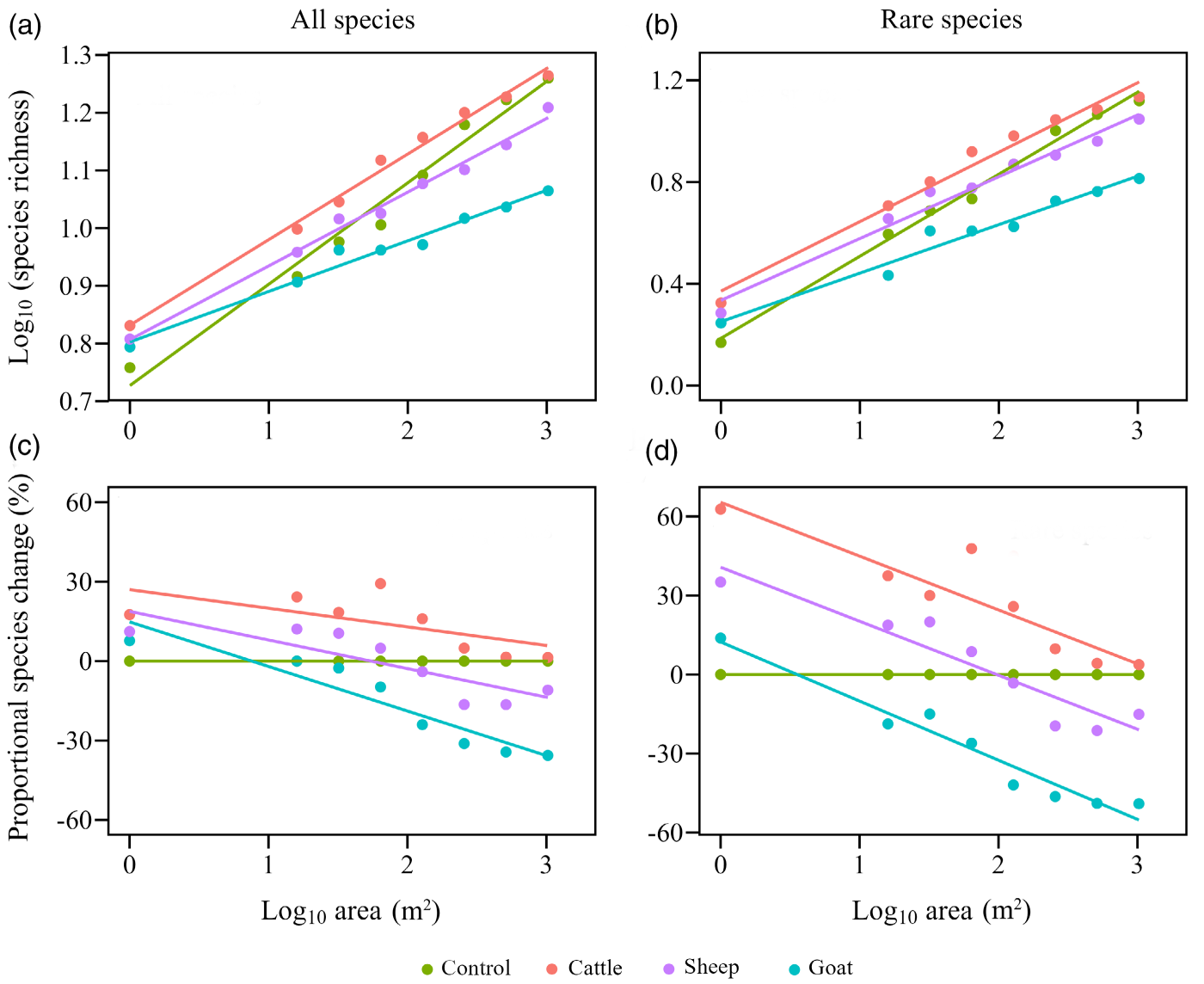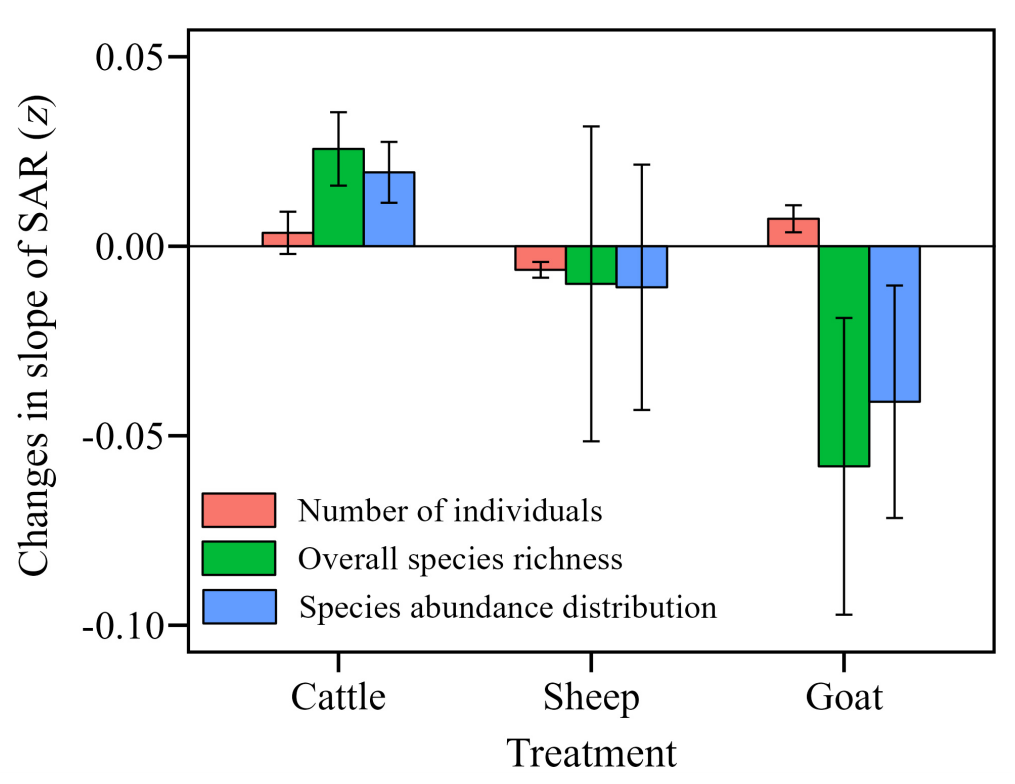 研究发现:首先,不同放牧动物对植物多样性的影响均存在尺度效应(图1)。其次,这种效应大小在牛、绵羊、山羊等放牧动物之间存在差异。牛在小尺度和大尺度上均比绵羊和山羊更加有利于植物多样性增加,而绵羊和山羊在大尺度上导致植物多样性显著降低(图1)。最后,不同放牧动物主要是通过改变植物的总物种数和物种多度分布进而调控不同空间尺度的植物多样性(图2)。