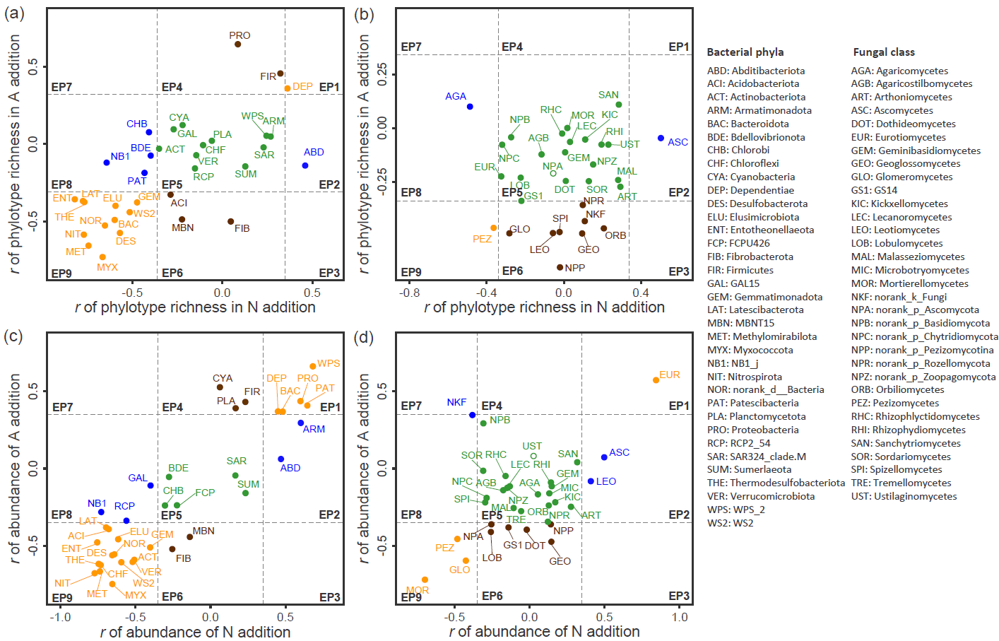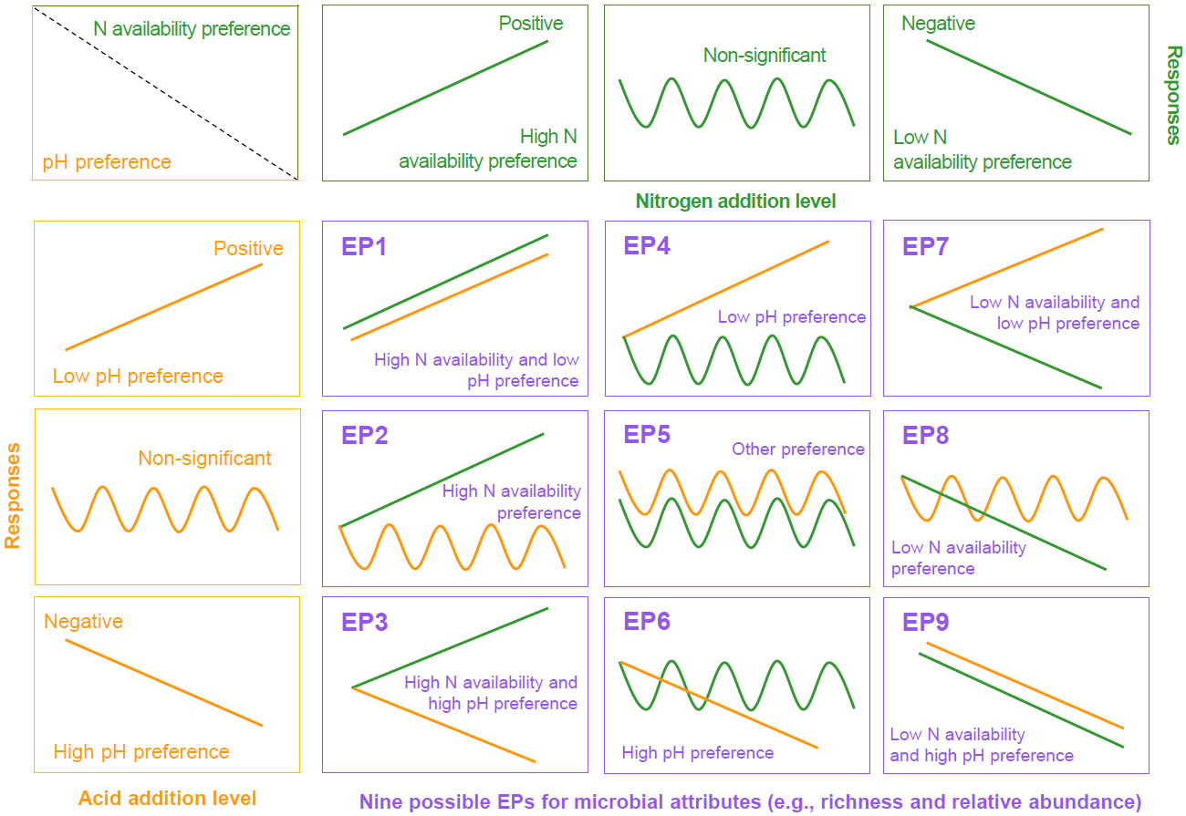 图1 依据土壤微生物对长期氮和酸添加的响应划分的9种潜在的环境偏好。EP1, 高氮低pH偏好类型;EP2,高氮偏好类型; EP3, 高氮高pH偏好类型; EP4, 低pH偏好类型; EP5,其他环境偏好类型; EP6, 高pH偏好类型; EP7, 低氮低pH偏好类型; EP8, 低氮偏好类型; EP9, 低氮高pH偏好类型