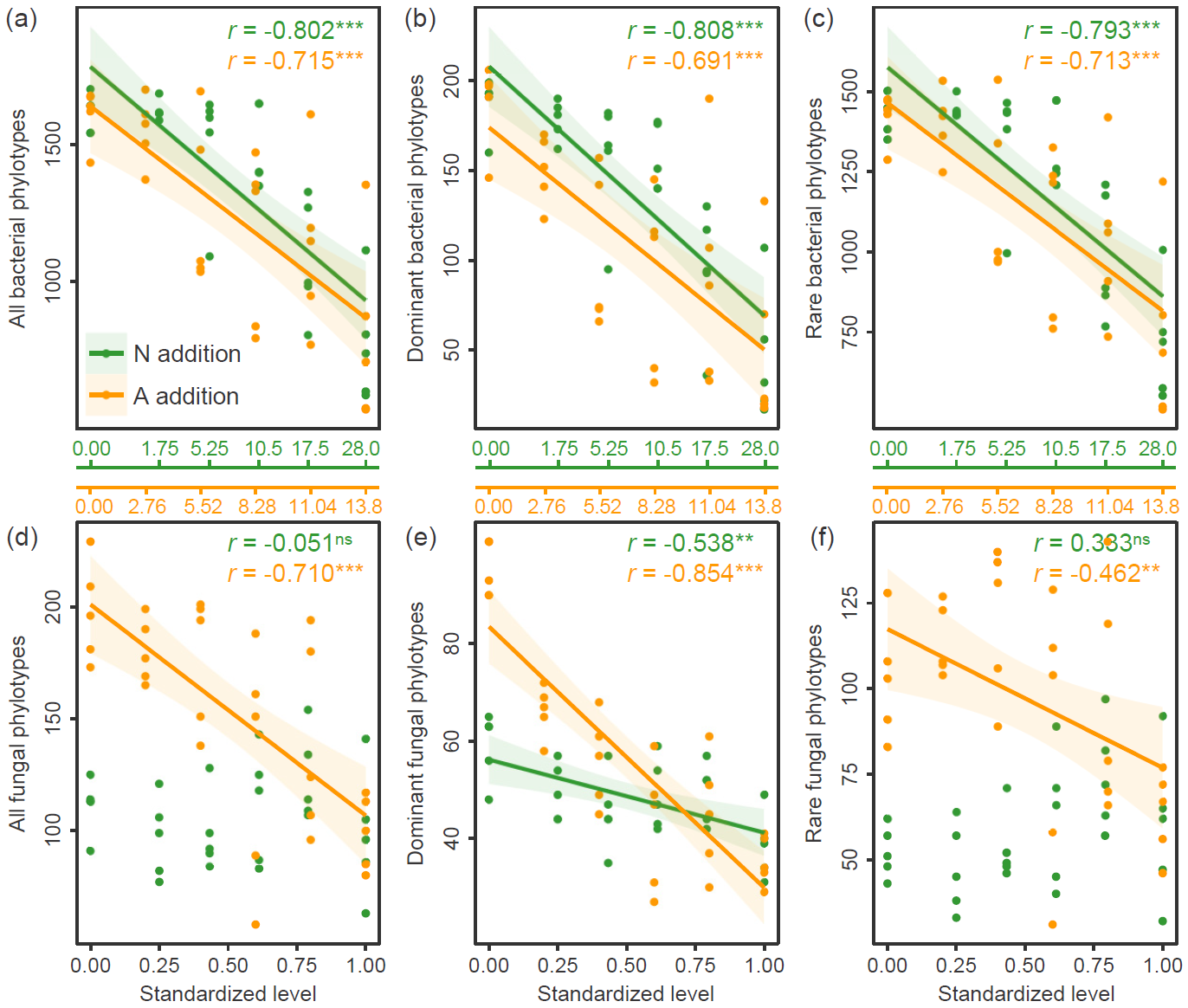 图3典型草原土壤细菌(a-c)和真菌(d-f)不同群落类型(总体群落、优势群落和稀有群落)丰富度对长期氮富集和土壤酸化的响应