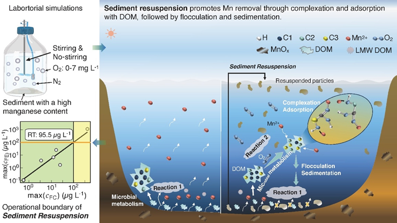 水源水库中底泥厌氧条件下释放还原态锰是供水系统重锰超标的重要发生源。通过底泥重悬提升沉积物氧化性可抑制锰释放,但同时给底泥带来的扰动也会增加锰的释放风险,相关机理尚不清楚。太阳成集团tyc122ccvip官网入口吕昌伟教授环境地球化学与健康创新组联合中国科公司生态环境研究中心杨敏研究员(国家杰青)团队,结合室内模拟与6个水源中的原位实践探究了底泥增氧与扰动下锰形态转化及去除机理,提出风险阈值,进一步明确了底泥重悬除藻降锰技术在水源中应用的边界条件,提升了供水系统中应对锰超标水质问题的防控应对能力。