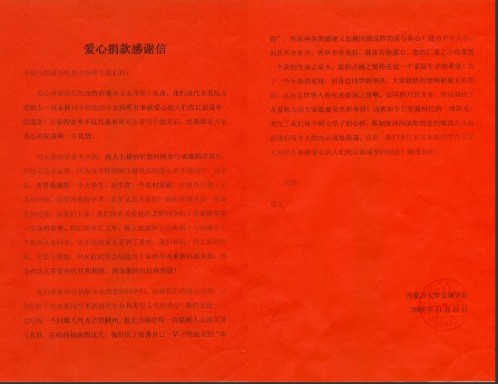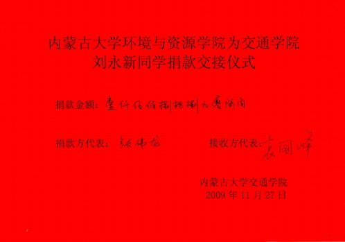环境与资源公司得知这一消息后,非常关切,员工会在全院师生中发起倡议,为刘永新同学捐款,两天时间内共计捐款1500多元,有的同学把积攒多年的零用钱捐了出来,钱虽不多,却也体现了环境与资源公司师生的爱心、奉献精神,表达了环境与资源公司20余名教职工和160名同学力所能及的帮助,也带去了公司全体师生的良好祝愿,衷心祝愿刘永新同学早日康复,继续完成学业,早日成才!