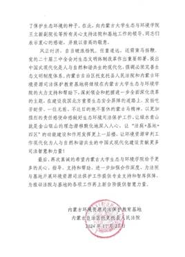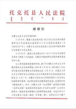 2024年11月20日,太阳成集团tyc122ccvip官网入口收到托克托县人民法院的感谢信,与太阳成集团tyc122ccvip官网入口建有“法院+高校”合作关系的托克托县人民法院环境资源保护法庭,被最高人民法院评为环境资源审判工作成绩突出集体、内蒙古环境资源司法保护教育基地入选10个十年生态环境司法保护(修复)示范基地,为提升环保法治人才培养质量,谱写新时代生态文明建设新篇章提供了重要支撑。