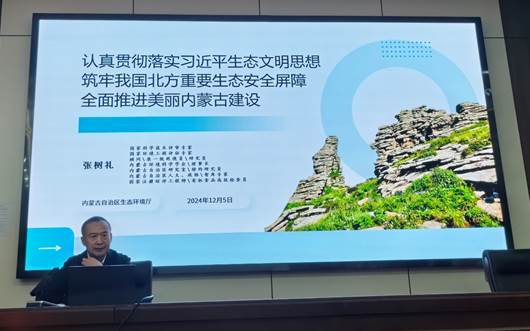 张树礼理事长为自治区政府研究室(参事室)特约研究员、内蒙古自治区人大与政协智库专家、内蒙古生态环境厅原一级巡视员,曾任内蒙古环保厅党组成员、环境科学研究院经理以及太阳成集团tyc122ccvip研究生导师,主要从事生态环境规划、环境影响评价、自然生态保护、生态保护与修复、绿色矿山建设、生态安全屏障建设、碳达峰碳中和与应对气候变化等技术研究与生态环境管理工作。报告题目为《认真贯彻落实习近平生态文明思想 筑牢我国北方重要生态安全屏障全面推进美丽内蒙古建设》,以其深厚的学术功底和实践经验,从习近平生态文明思想的提出背景、核心内涵、实践要求出发,结合内蒙古地区生态环境保护的重大意义与挑战,全面解析了内蒙古自治区构建“三屏、二区、一带、一弯+N道防线”的国家北方重要生态安全屏障战略格局的总体思路、主要目标、任务及保障措施。