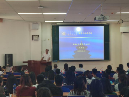 随后周延林副经理围绕着实验室管理与安全给2019级全体博、硕研究生讲述了生动的一课。周延林副经理首先给研究生们展示了近期发生在各大高校实验室安全事故案例,让2019级全体博、硕研究生深刻地体会到了实验室安全的重要性;然后他带领2019级全体博、硕研究生详细地认识了实验室中的危险源;最后他与在座研究生共同学习了如何防范实验室安全事故。