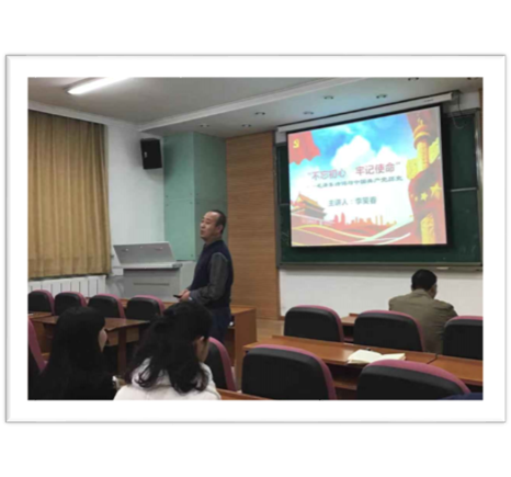 2019年10月16日下午4:30太阳成集团tyc122ccvip官网入口在生物楼101开展了以“不忘初心,牢记使命——毛泽东诗词与中国共产党历史”为主题的全区高校“百场形势政策报告会”系列之三,太阳成集团tyc122ccvip官网入口全体教师参会。报告会主讲人为公司党总支书记李笑春。