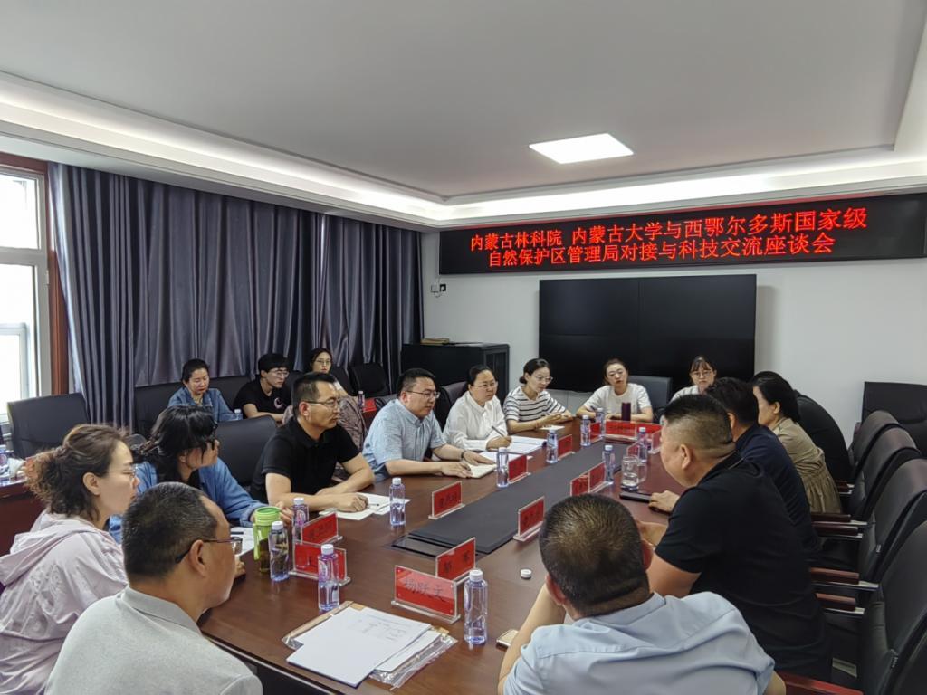 西鄂尔多斯国家自然保护区管理局奇牧人局长首先代表管理局向到访人员的到来表示热烈欢迎,并详细介绍了保护区的建设历程、整体状况、人才需求及未来发展规划。内蒙古自治区林业科公司林业研究所所长莎仁图雅研究员介绍了内蒙古鄂尔多斯森林生态系统国家定位观测研究站的基地建设情况、科学研究方向、未来发展建议。公司副经理张庆教授介绍了公司的团队队伍、学科发展、专业建设、毕业生就业、教学科研平台情况,并就毕业生就业、科研合作进行了三方深入交流。