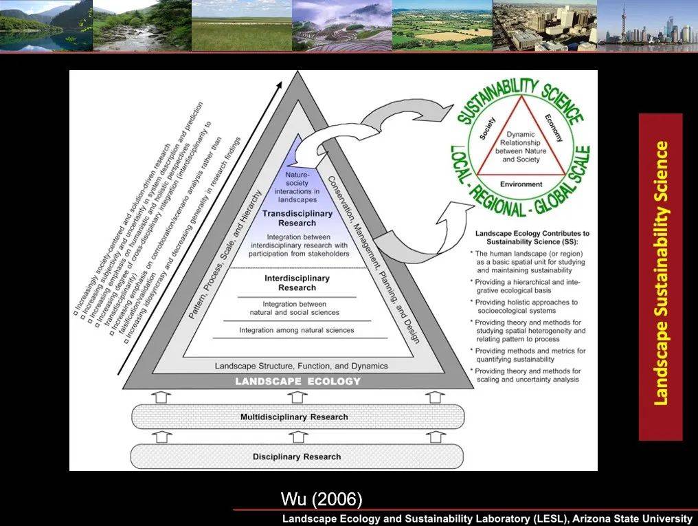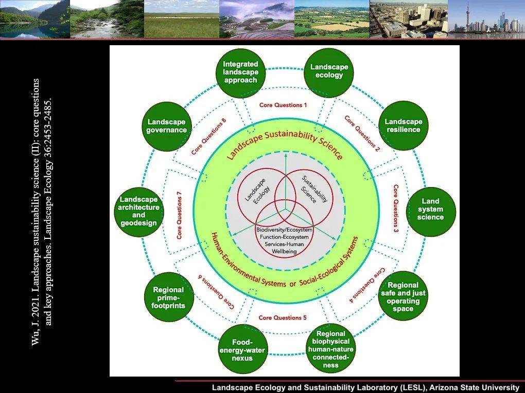 邬建国教授提出了景观可持续科学的主要问题以及关键路径,分别是景观生态学(landscape ecology)、景观韧性(landscape resilience)、土地系统科学(land system science)、区域安全公正空间(regional safe and just operating space)、区域生物物理人与自然连通性(regional biophysical human-nature connectedness)、食品-能源-水联盟(food energy-water nexus)、区域主要足迹(regional prime footprints)、风景园林与地理设计(landscape architecture and geodesign)、景观管治(landscape governance)、综合景观方法(integrated landscape approach)。