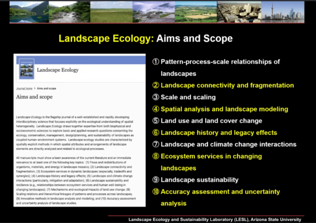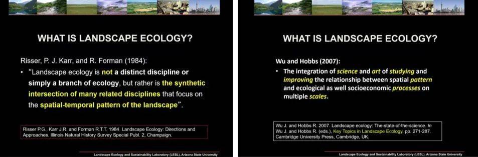 邬建国教授认为,景观生态学最具有里程碑意义的定义是1984年Paul G. Risser和其他学者提出的,他们认为景观生态学不是一门独立的学科或生态学的一个简单分支,而是关注景观时空格局的多个相关学科的交叉综合。经过几十年的发展,现代景观生态学不仅关注景观中的生物多样性、生态学过程和生态系统服务,还追求景观的可持续性,这是景观规划设计的一个最终目标,其核心是维持和提高人类福祉。邬建国教授和Richard J. Hobbs在2007年对各种景观生态学定义进行了概括和综合,并将其定义为“在多个尺度上研究和改善空间格局与生态和社会经济过程之间关系的科学和艺术的融合”。