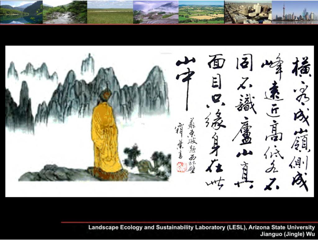 景观的研究不仅仅是对生物学和物理学的了解,还有许多人文因素的影响,因为景观是环境和人类互相作用的系统。研究景观异质性和格局,需要考虑不同尺度和不同视角的影响,因此需要采用多种不同的研究方法。邬建国教授用苏轼《题西林壁》中的诗句来形象地表达景观生态学的基本原理和方法论,这首诗强调了景观的异质性和多样性,以及研究景观应该采用多尺度、多视角和多方法的方法。此外,邬建国教授还总结了不同时期景观生态学的十大研究论题,其中包括景观格局的优化,指出景观规划和设计的核心是优化景观,使其更可持续。