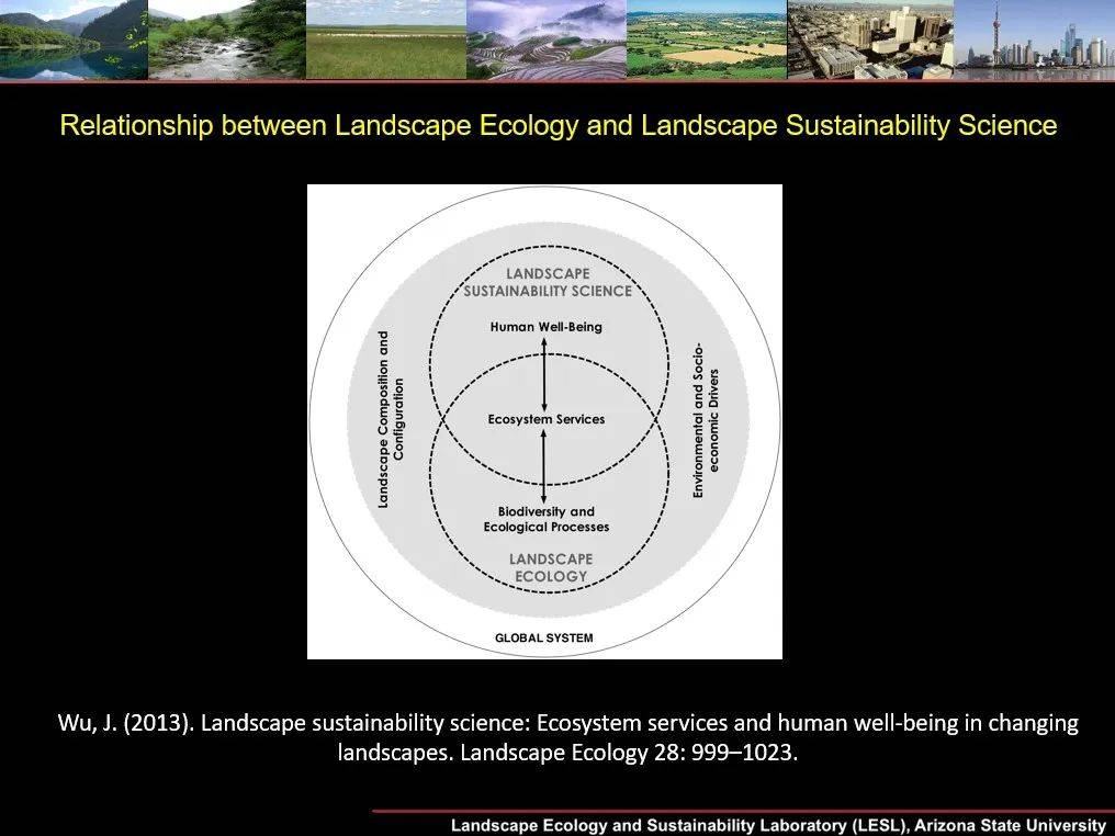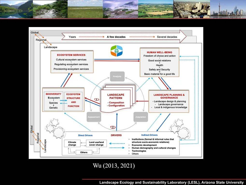 此外,邬建国教授介绍了景观可持续科学的发展历程。他在2013年将景观可持续性定义为:“景观可持续性科学是 聚焦于景观和区域尺度的,通过空间显示方法来研究景观格局、生态系统服务和人类福祉之间相互关系的科学”。景观生态学应该与可持续性相结合,景观规划师应加强对可持续性科学的学习和理解,特别是在人地关系研究方面,如何将景观生态学的理论应用于实践,通过景观规划和设计来实现景观的可持续性,促进生态系统服务和人类福祉的改善。他指出景观可持续科学与景观生态学的共同点在于以景观为平台和抓手,但景观生态学注重生物多样性、生态过程和生态系统服务,而景观可持续科学的主要目的是为了人类福祉。生态系统服务则是连接景观生态学和可持续科学的纽带和桥梁。